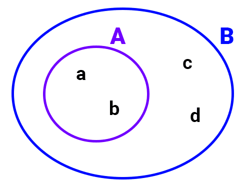 - The set A = {a, b} is a proper subset of B = {a, b, c, d} because the elements of A are also within B and there are elements in B that are not in A ("c" and "d"). Therefore, A ⊂ B. Note that it is also true that A ⊆ B.
